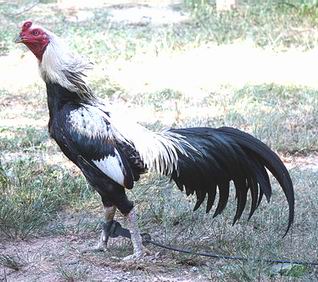 Domestic Philippine Gamefowl are the majority these days and outnumbered by the flood of American Game (eg, Hatch, Kelso, Democrat, Tarheels, Whitehackles, Miner Bleus, and so on). American Games that were bred to fight in the metal spurs (gaffs, slashers, long and short blades). The birds are fast, accurate and agile. Because strains of the U.S. reputation they took over the supremacy in the Philippines. Breed profile: single comb, rosecomb and peacomb (crossed with Asian gamefowl). eyecolour white, red, orange and brown, shank white, yellow, gray (depending on coat color), red or black face, the back line slopes downward, upward pointing tail. A variety of colors. Description: Filipino domestic birds generally higher at stations. Weight max. approx. 2, 5 Kg (5.5 lbs). Small populations in Europe excists. Photo (left): the bird from the right Legaspi Photos: Super-SS-Gamefarm (Tanjay / Philippines)